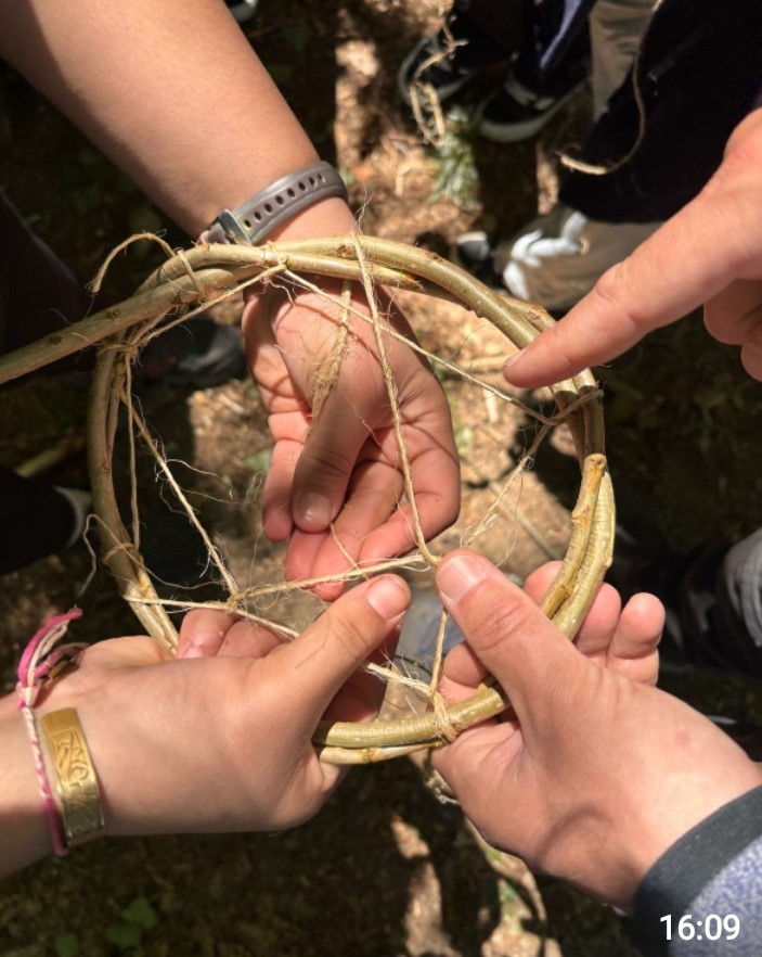 « On est allé pique-niquer à la Frange Verte pour ensuite aller marcher en forêt. Au fur et à mesure, on a fait des haltes et Antoine de l’association Gentiana et Pierre et Céline de la bibliothèque nous ont raconté des contes : le conte sur l’invention du nom des arbres avec le séquoia et le sureau noir, l’ histoire du charme et l’histoire de la forêt et du ruisseau. Puis Antoine a animé un temps de vannerie pour fabriquer un attrape rêve après avoir écouté une histoire. On a pris des branches auxquelles on a enlevé les feuilles. Puis on les a tordues doucement ».